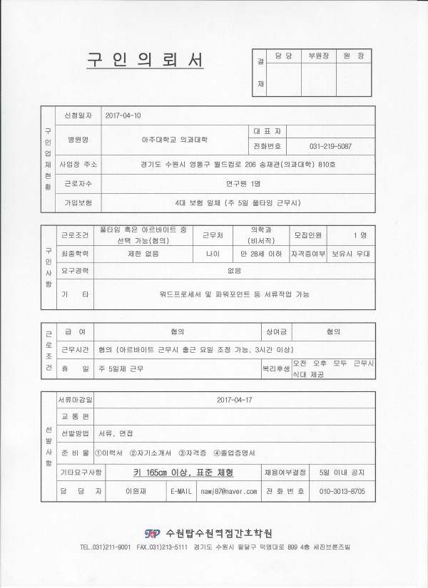 | 제목 | 아주대학교 의과대학 비서직 채용공고입니다. | 작성일 | 17-04-10 18:12 |
