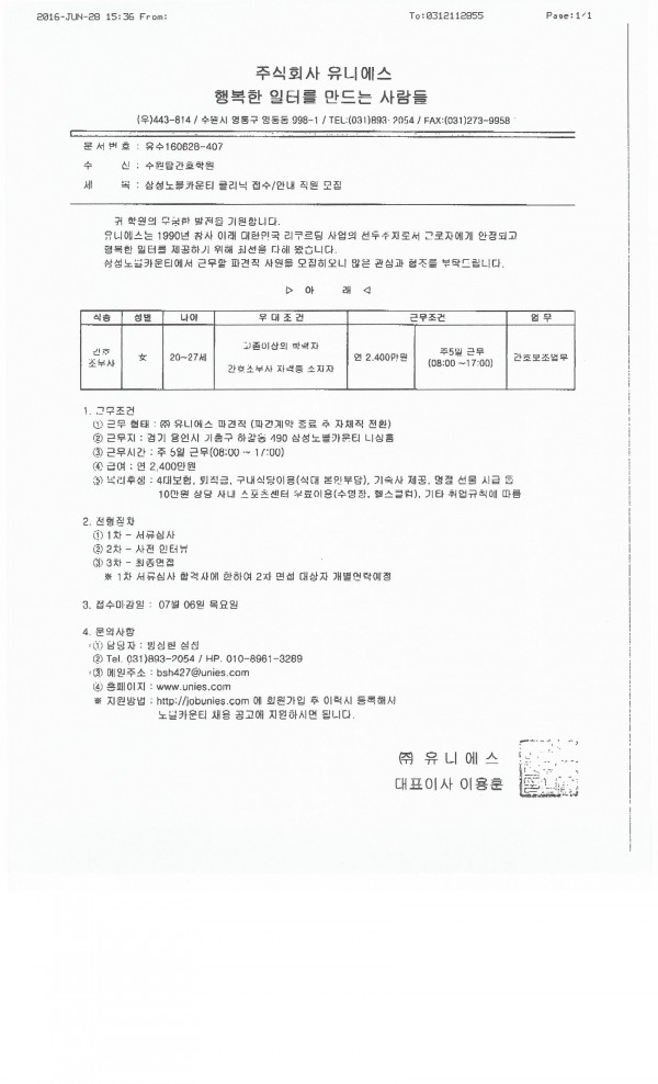 | 제목 | 삼성 노블카운티 클리닉에서 채용정보가 왔습니다. | 작성일 | 16-06-29 11:55 |