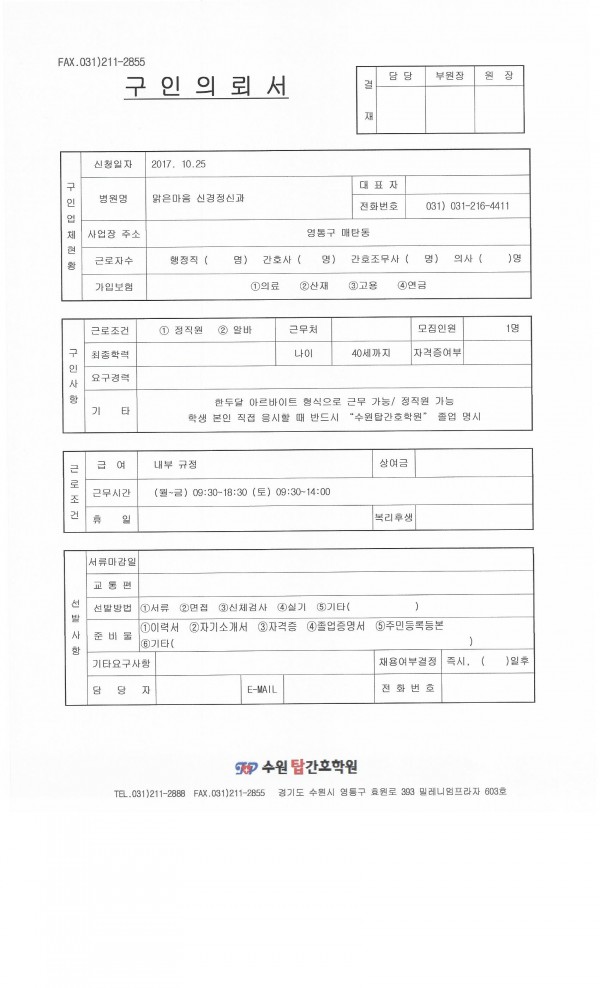 | 제목 | 맑은마음 신경정신과 의원 채용공고입니다 | 작성일 | 17-10-25 14:05 |
