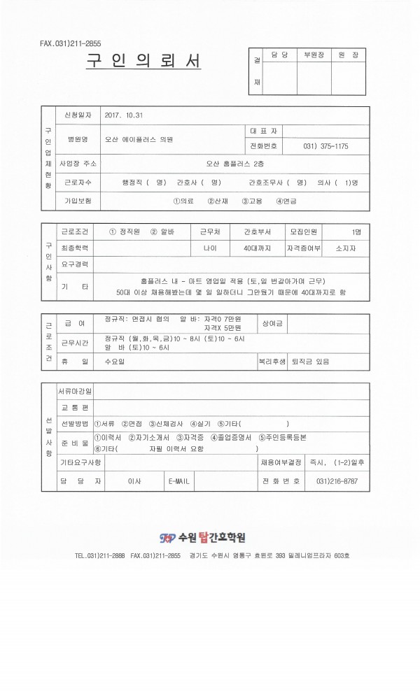| 제목 | 오산 에이플러스 의원 채용공고입니다 | 작성일 | 17-11-01 10:38 |
